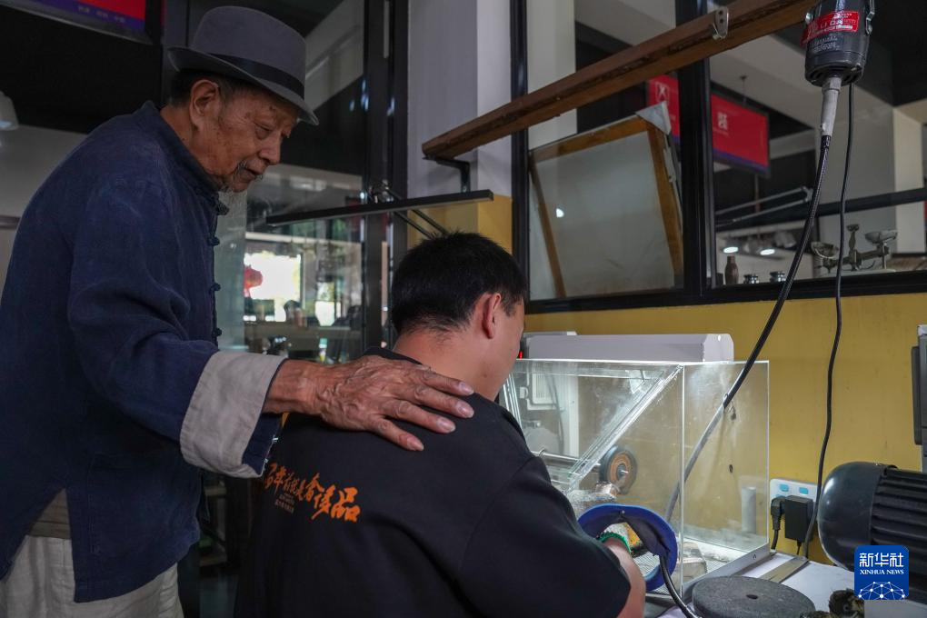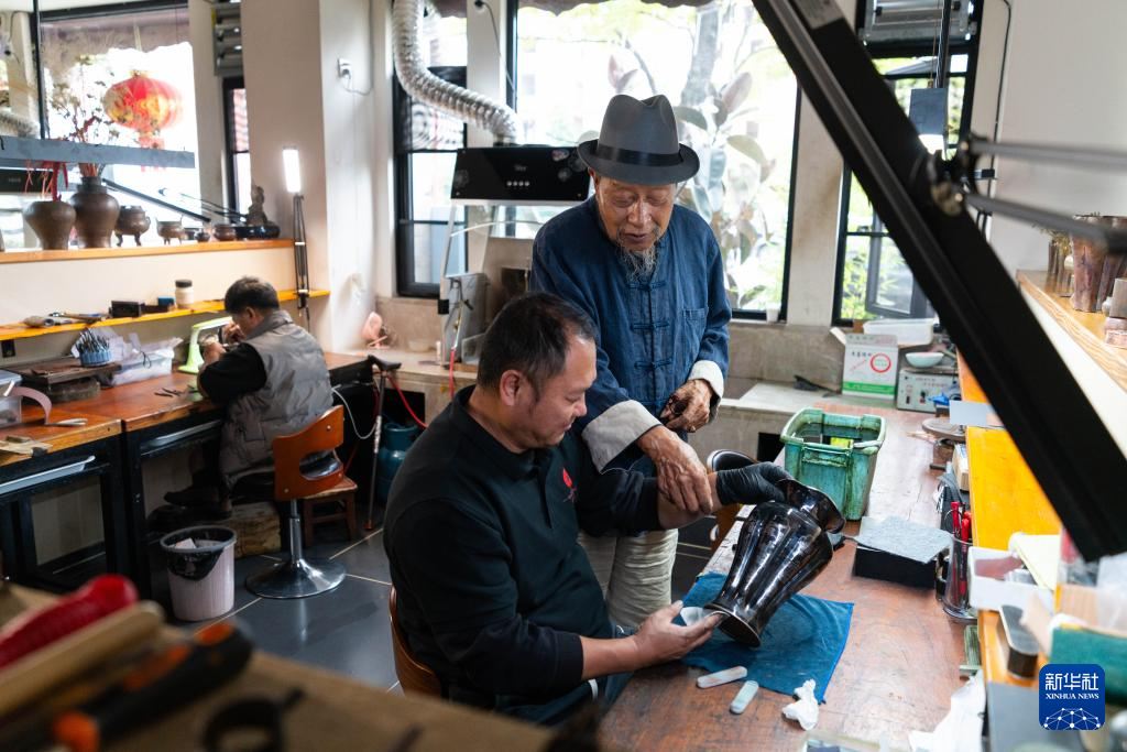 10月25日,在昆明乌铜走银传习馆,弟子在金永才指导下进行细打磨作业。新华社记者 彭奕凯 摄