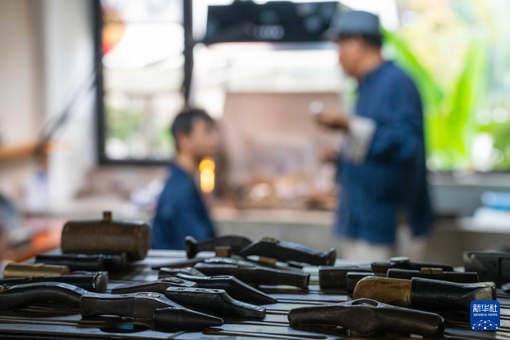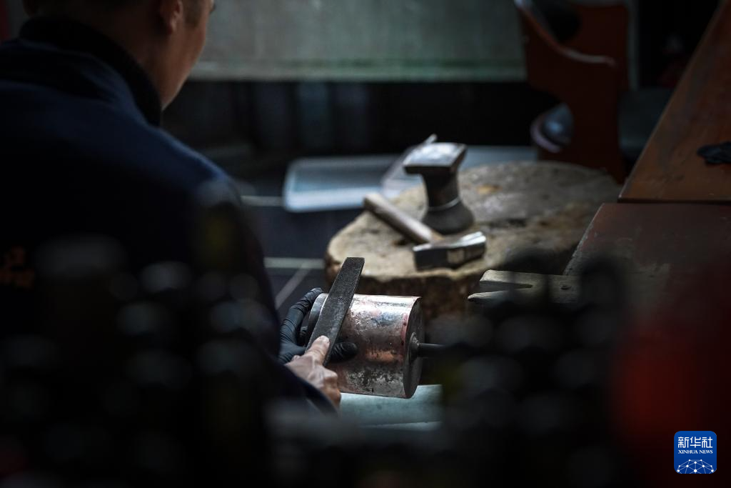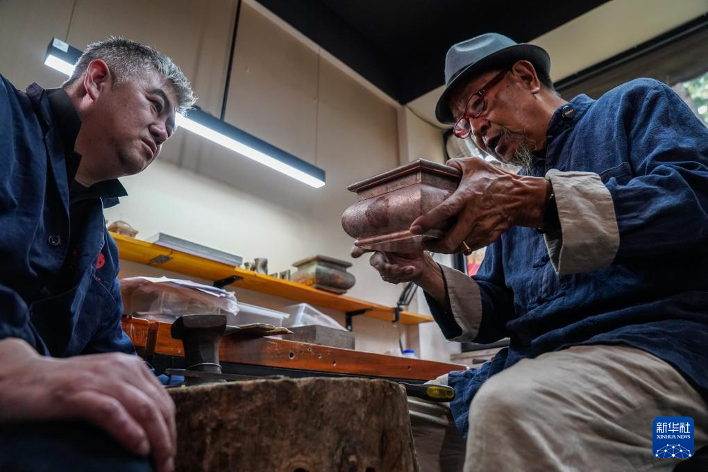 10月25日,在昆明乌铜走银传习馆內,匠人在捶打铜片。新华社记者 彭奕凯 摄