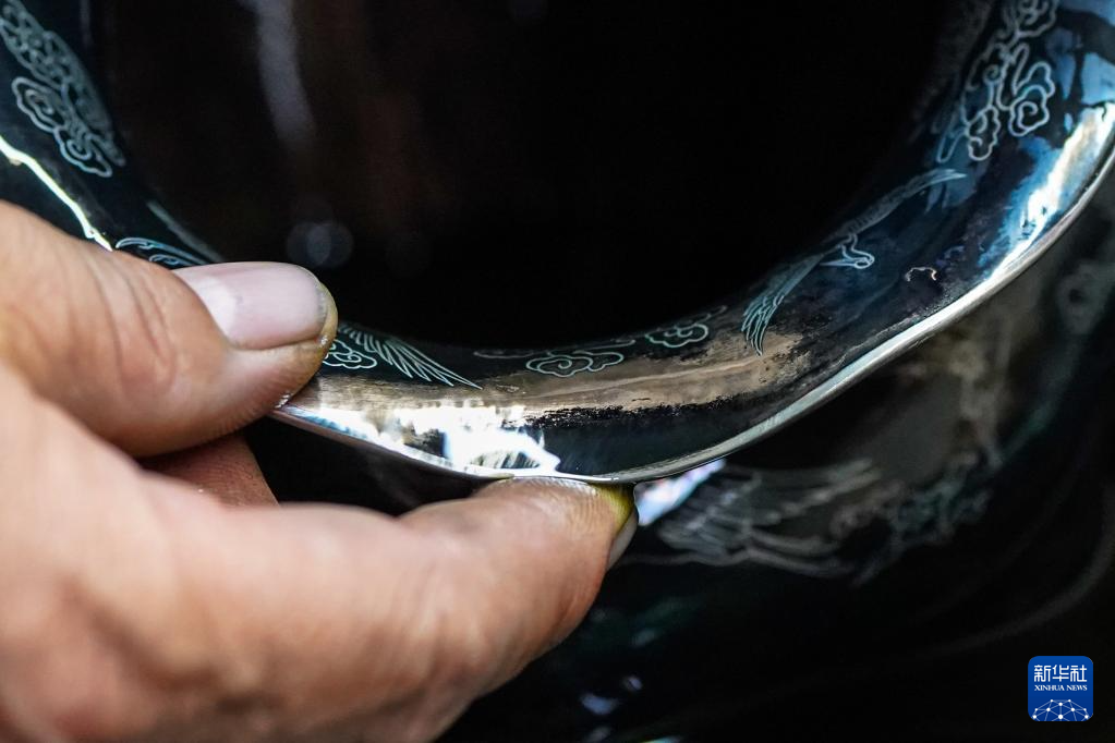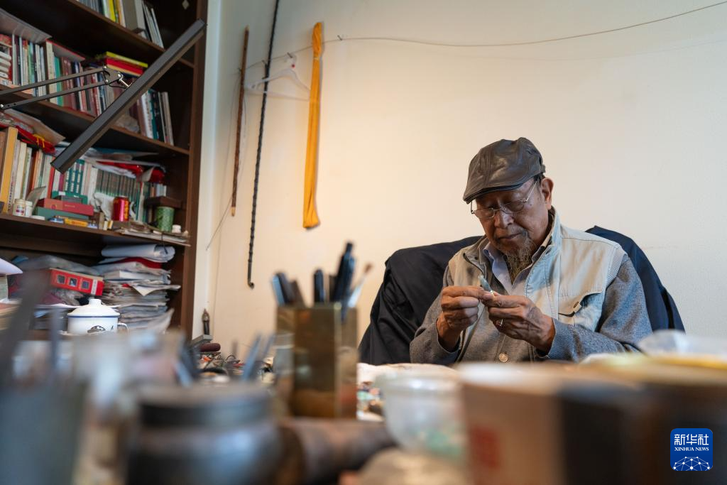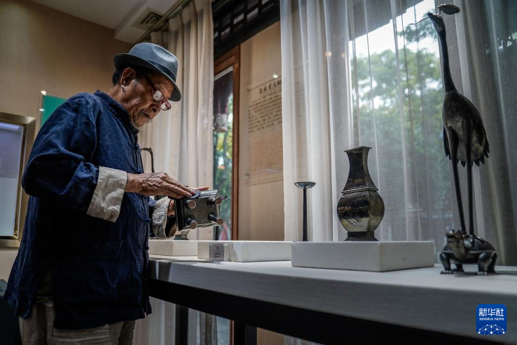 10月25日,在昆明乌铜走银传习馆,金永才在擦拭保养乌铜走银作品。新华社记者 彭奕凯 摄