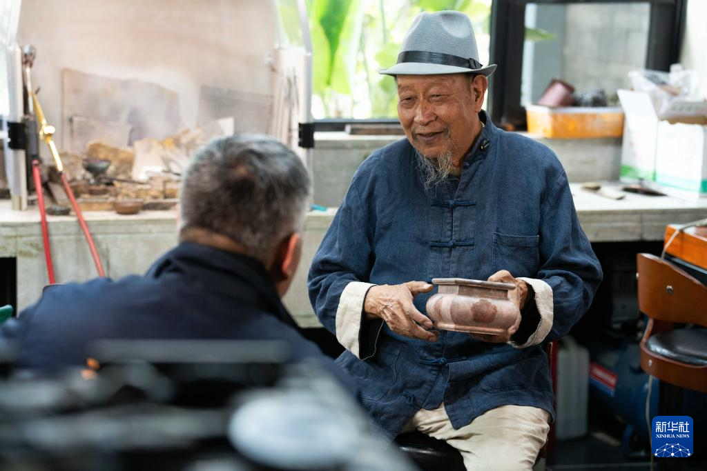 10月25日,在昆明乌铜走银传习馆,金永才(右)与弟子交流。新华社记者 彭奕凯 摄