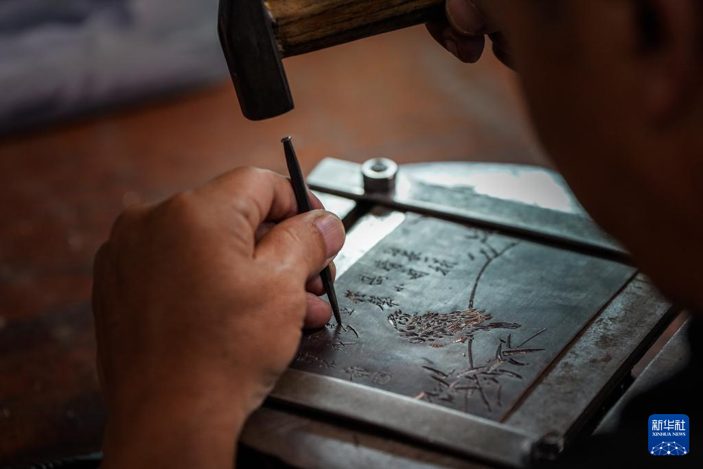 10月25日,在昆明乌铜走银传习馆,匠人在铜板上錾刻纹路凹槽。新华社记者 彭奕凯 摄
