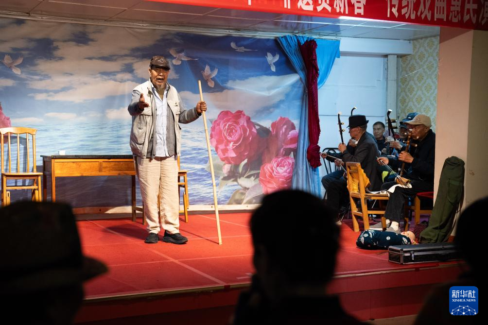 10月27日,金永才与戏友在昆明市云溪社区活动中心排练花灯戏。他常常登上花灯戏台与老友们共同演出,在婉转的唱腔与水袖翩跹间捕捉灵感。他试图将那流动的韵律、舒展的线条,融入坚硬的金属之中。新华社记者 高咏薇 摄