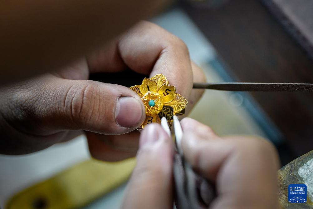 10月25日,在昆明乌铜走银传习馆,匠人在制作乌铜走银首饰。新华社记者 彭奕凯 摄