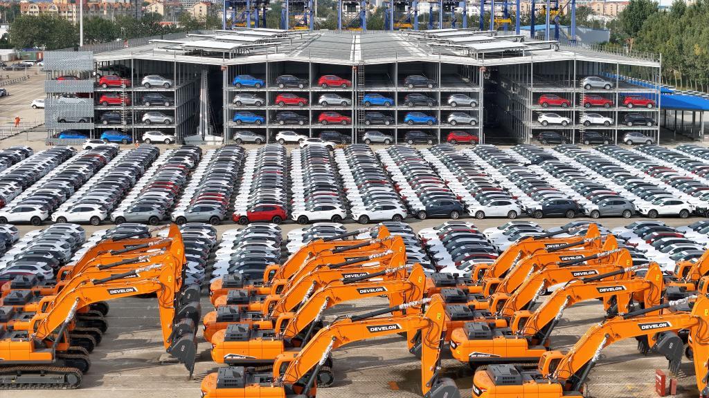 △山东港口烟台港,国产汽车和工程机械集结等待装船出口。