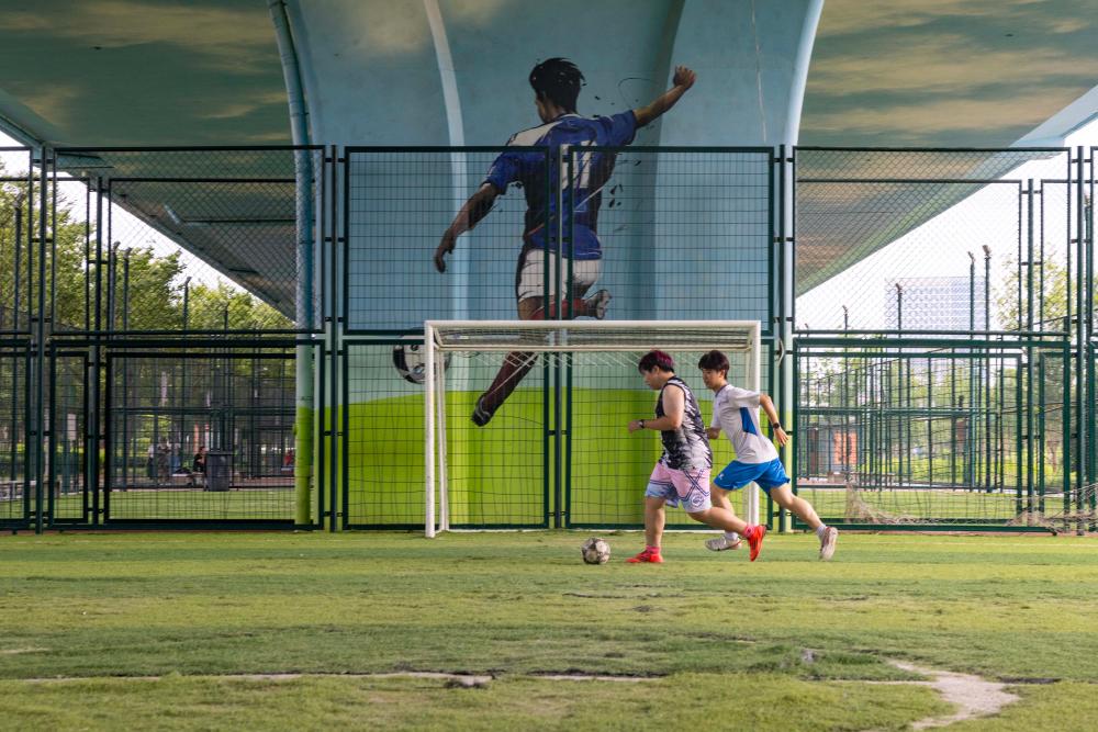 6月29日,两位市民在江苏省泰州市东环高架体育公园踢足球。新华社发(汤德宏 摄)