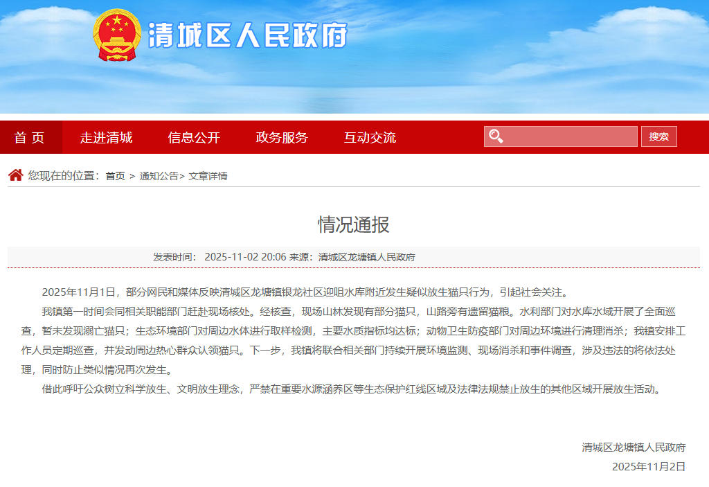11月1日,部分网民和媒体反映清城区龙塘镇银龙社区迎咀水库附近发生疑似放生猫只行为,引起社会关注。
