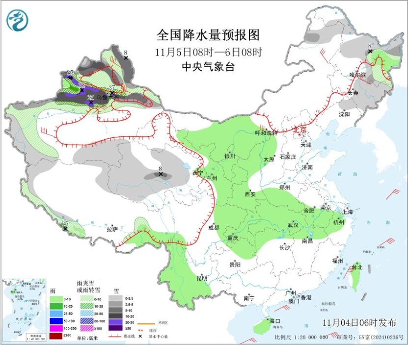 央视网消息:中央气象台最新预报,11月4日夜间至9日,将有一股较强冷空气自西向东影响我国大部地区。其中4日夜间至7日,主要影响新疆、内蒙古西部及青藏高原;8-9日,冷空气继续东移南下将影响长江以北大部地区。预计受冷空气影响,上述地区将出现显著的大风降温天气,新疆西北部、内蒙古西部和东北部、东北地区北部和东部局地降温10℃以上,新疆山口地区风力8~9级、阵风10~11级;新疆北部、内蒙古中东部、黑龙江北部将有较强降雪,新疆北部高海拔地区有暴雨到大暴雪,新增积雪深度8~15厘米,局地可超过20厘米。
