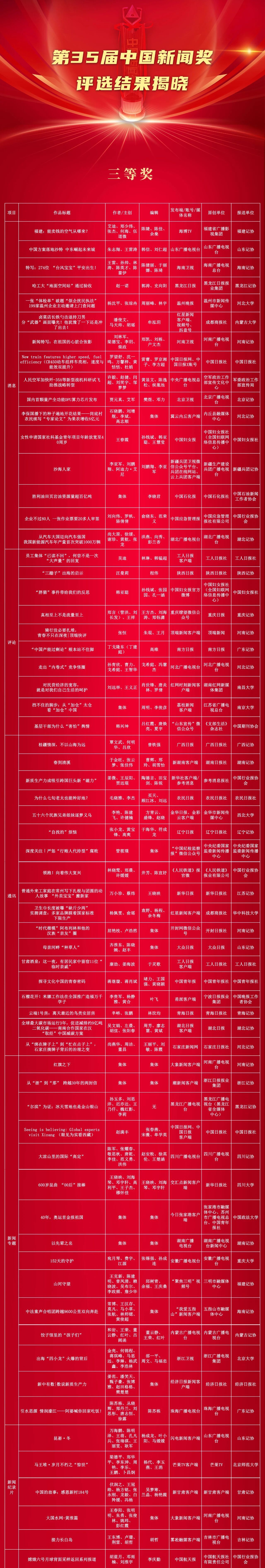 由中华全国新闻工作者协会主办的第35届中国新闻奖评选结果于11月5日揭晓。