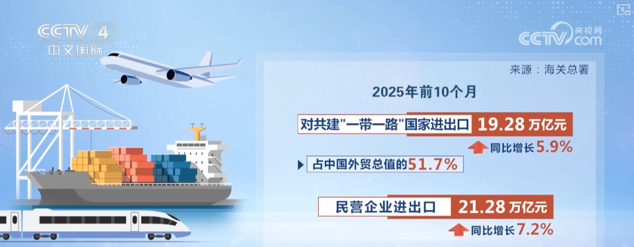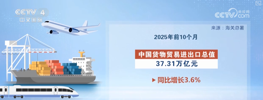 央视网消息:海关总署11月7日对外公布,2025年前10个月,中国货物贸易进出口平稳增长,进出口总值37.31万亿元,同比增长3.6%,中国外贸面对外部冲击展现强大韧性。