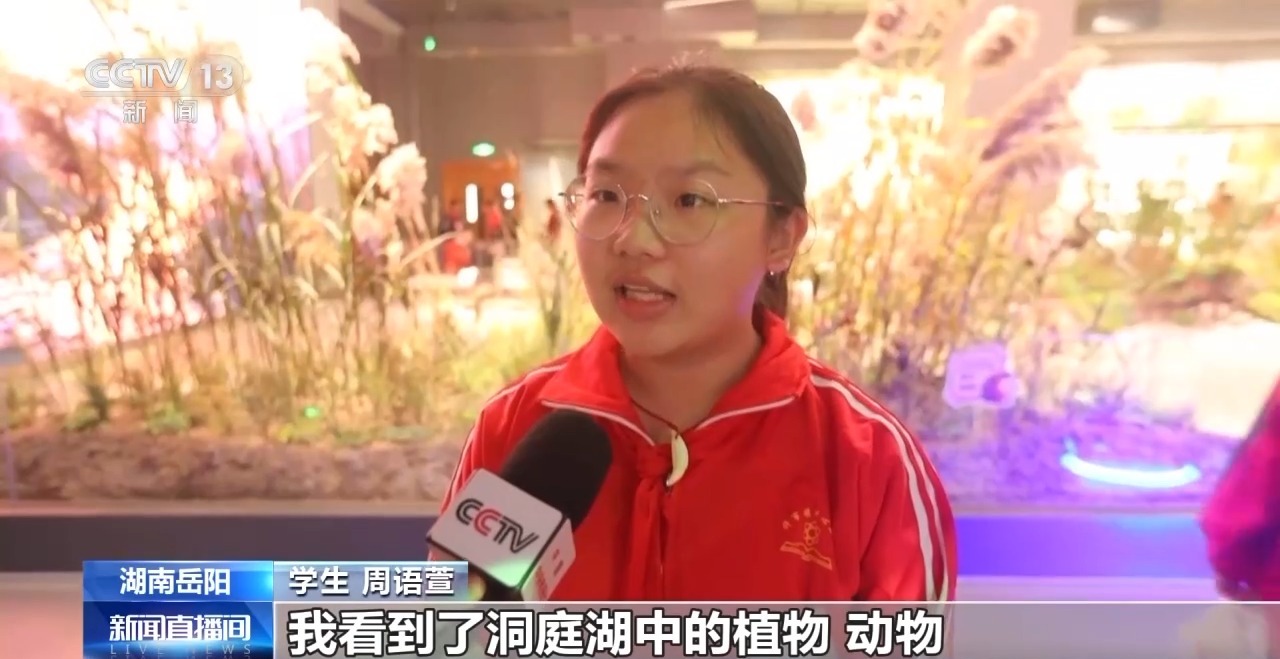 学生 周语萱:我看到了洞庭湖中的植物、动物,用这里的VR眼镜等技术看到了许多,我们平常观察不到的自然景象,让我感觉非常新奇。