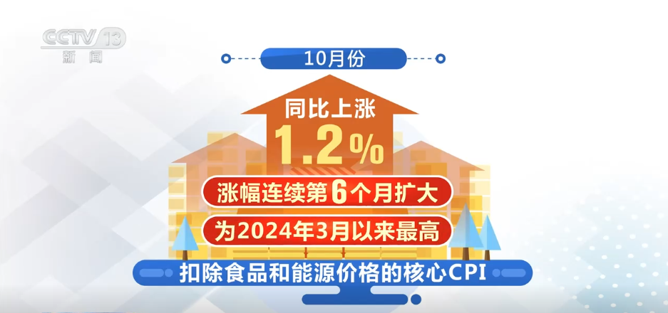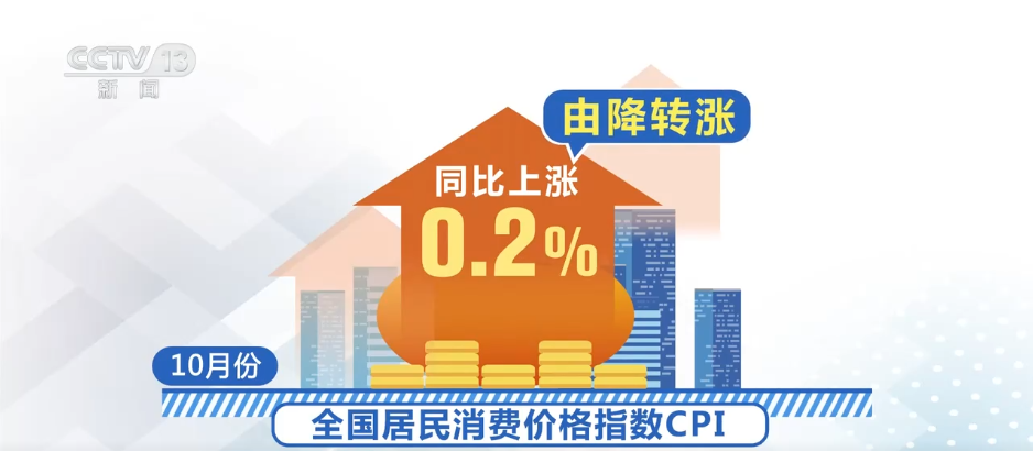 央视网消息:国家统计局11月9日发布,随着扩内需等政策措施持续显效,全国居民消费价格指数(CPI)同比由上月下降转为上涨0.2%,扣除食品和能源价格的核心CPI同比继续上涨,涨幅连续第6个月扩大。