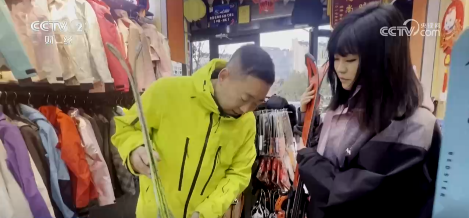 店长介绍,新雪季的消费热度远超预期,兼具保暖性与时尚感的专业雪服、轻量化高性能雪板最受青睐。除了线下门店热销外,线上预订、同城配送等便捷服务成为销售新亮点。