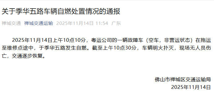 11月14日上午10点10分,粤运公司的一辆故障车(空车,非营运状态)在拖运至维修点途中,于季华五路发生自燃。截至上午10点30分,车辆明火扑灭,现场无人员伤亡,交通逐步恢复。