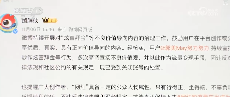 近日,两名网红账号接连被封禁,引发社会关注。11月6日,微博官方账号发文称,用户“郭美May努力努力”持续炒作炫富拜金等行为,多次高调宣扬不良价值观,并以此作为流量变现手段,因违反法律法规和社区公约的有关规定,受到关闭账号的处置。