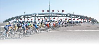 跨境赛事公路自行车男子个人赛中,选手通过港珠澳大桥闸口。新华社记者 邓 华摄