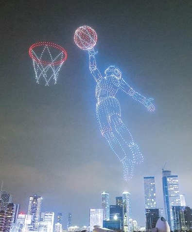 无人机在深圳夜空中组成投篮画面。朱洪波摄