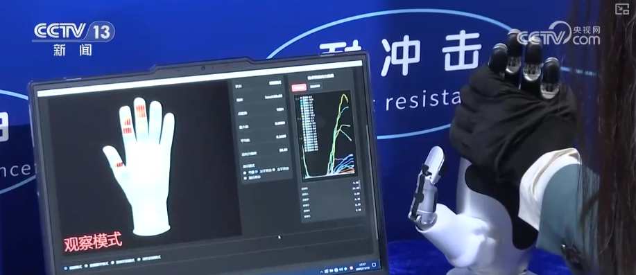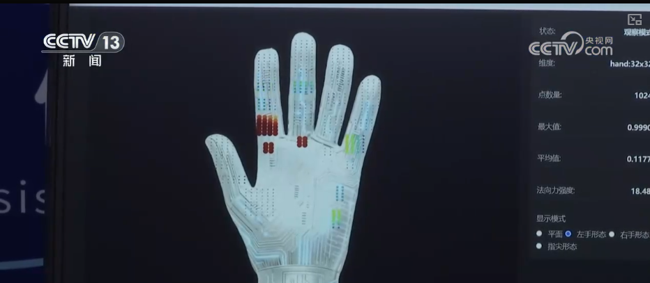 记者手上佩戴的就是本届高交会上刚刚亮相的一个新技术,全手掌覆盖电子皮肤触觉手套。这个手套可以帮助我们更好地去感知这个世界,比如说可以记录出它的一些温度压力等数据。当记者用力去握住话筒的时候,电脑上实时的看到这些数据的反馈和变化。通过这样的一个触觉手套,可以帮助机器人更好感知世界。如果人类戴上这样的手套,轻便地去执行一些任务的时候,也可以帮助机器人去采集一些真实世界的数据。