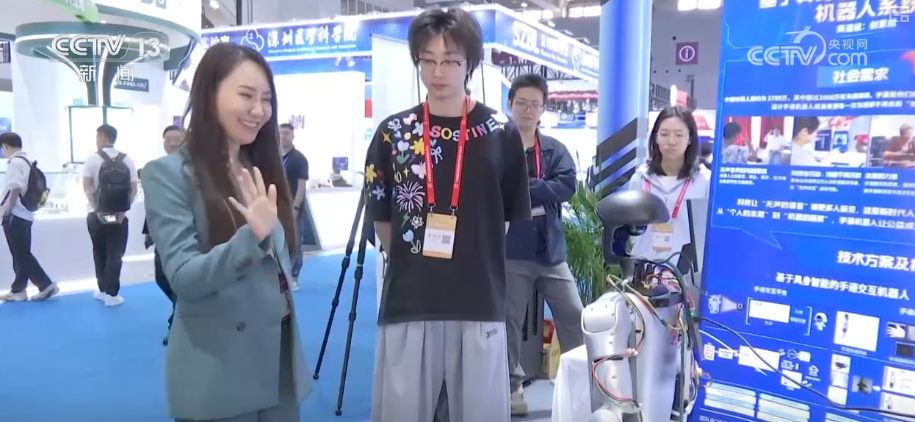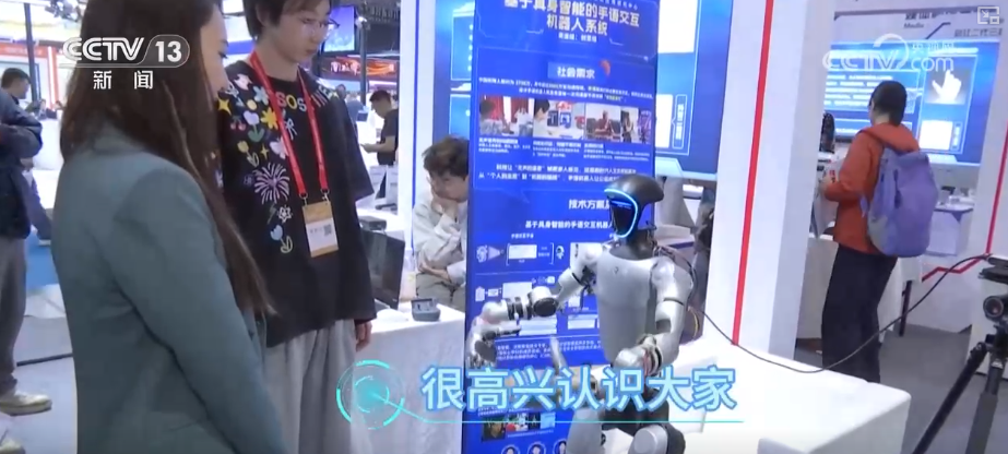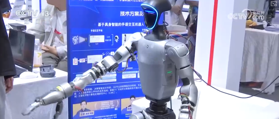 和记者互动的就是搭载了我国首个手语具身智能的手语交互系统的具身智能机器人,通过它搭载的具身智能模型,可以让普通的具备灵巧手功能的机器人,拥有手语交互能力。
