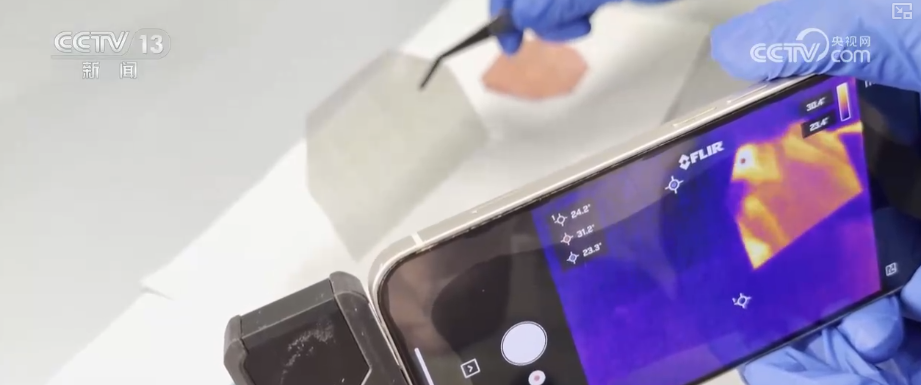 深圳清华大学研究院智能无源热控技术研发中心主任董恺琛介绍,它是个智能控温材料,可以在高温下把多余的热量散到外面。当温度变低时自动切换成保暖模式,帮助它下面覆盖物体保持住温度。目前,材料的成本大概每平方米可以控制在100元或者是更低。