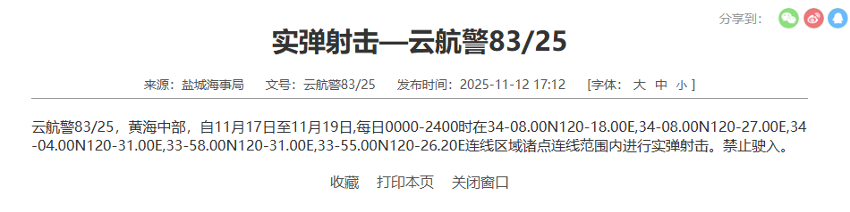 正在阅读:【8点见】航行警告!黄海中部连续三天实弹射击!