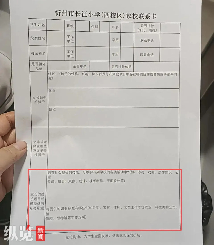 ·山西忻州一小学要求填写“家长可提供的社会资源”,校方致歉。