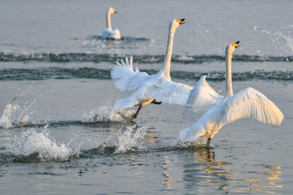 在山西平陆黄河湿地,大天鹅在嬉戏。新华社记者曹阳 摄
