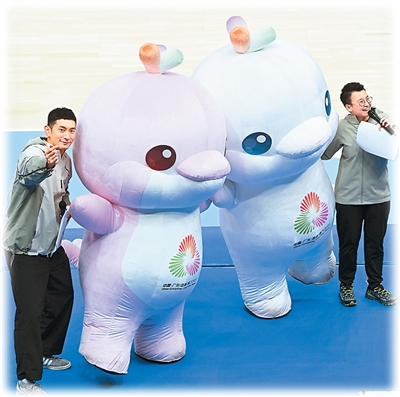 第十五届全国运动会吉祥物与观众互动。