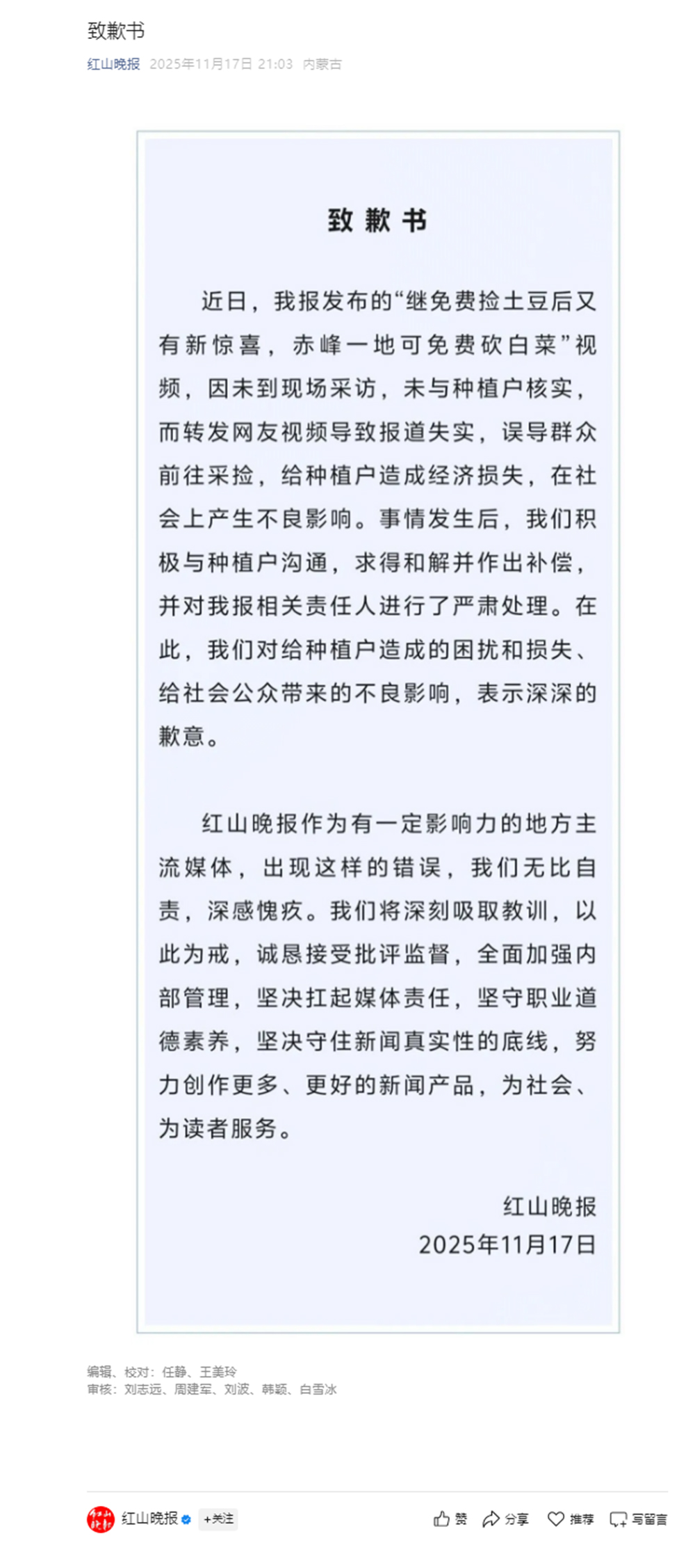 ·红山晚报就“免费砍白菜”失实报道致歉:深刻吸取教训,诚恳接受批评。