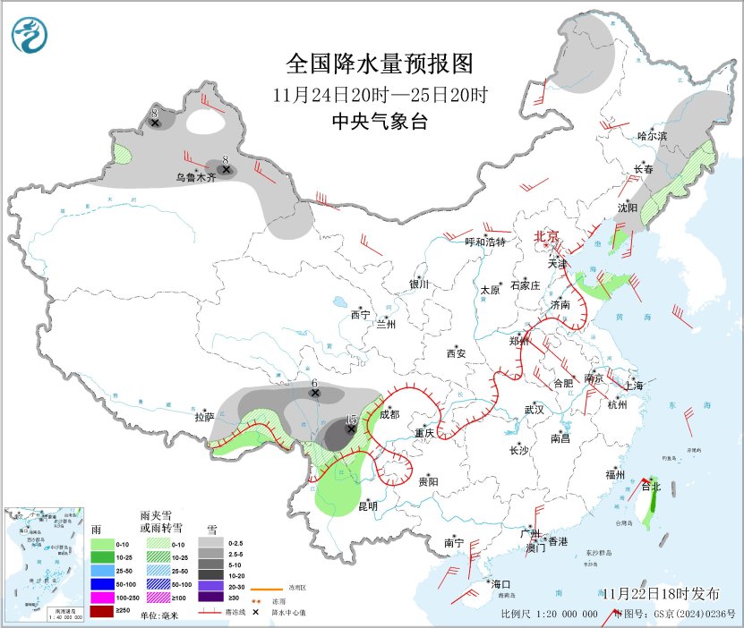 11月23日20时至24日20时,内蒙古中东部、东北地区中南部、甘肃中东部、宁夏、青海东北部、川西高原南部、云南西北部、西藏东部等地部分地区有小雪或雨夹雪,其中,内蒙古东部、西藏东部、四川西部等地部分地区有中到大雪,局地暴雪(10~12毫米);东北地区东南部、四川盆地南部、重庆东南部、贵州北部、云南东北部等地部分地区有小雨。内蒙古中西部、青海北部和东部、西北地区东北部、华北等地部分地区有5~7级大风,阵风8~9级,黄淮北部和西部、江汉等地部分地区有5~6级大风,局部地区阵风7~8级(见图4)。