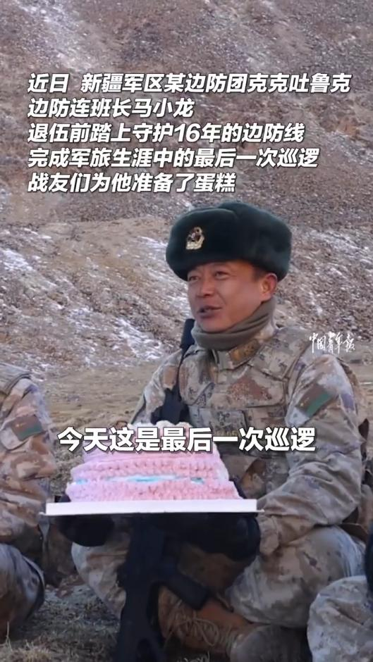 近日,新疆军区某边防团克克吐鲁克边防连班长马小龙退伍前踏上守护16年的边防线,完成军旅生涯最后一次巡线任务,战友们为他准备蛋糕送行。
