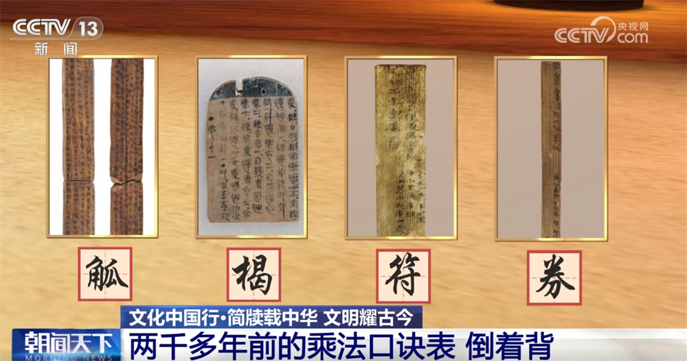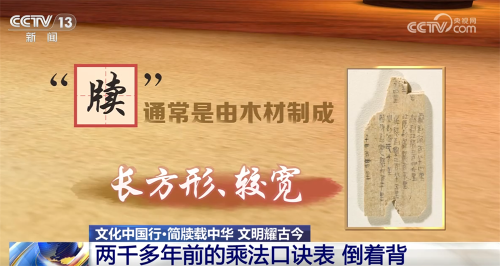 简牍,是“简”和“牍”二者的合称,简通常是由竹子制成,长条形、较窄;而牍则通常是由木材制成,长方形、较宽,此外还有木质多面体的“觚”以及楬、符、券等多种形式。现场展出的这枚出土于湖南里耶古城的秦朝木牍,就是迄今考古发现最完整的《九九乘法表》。