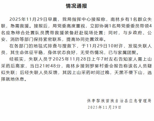 央视网消息:据保亭应急管理微信公众号消息,海南保亭应急管理局11月29日晚通报,11月29日早晨,指挥中心接报称,南林乡有1名群众失联,急需救援。接报后,海南保亭应急管理局党委高度重视,立即协调1名局党委委员带领4名应急综合处置队员携带救援装备赶赴现场处置;同时,与乡政府、公安、消防等部门保持紧密联系,提高协同处置效率。在各部门的地毯式排查与搜救下,于11月29日10时许,发现失联人员,其生命体征平稳,身体状态良好,无受伤情况,已与家属团聚。经核实,失联人员于2025年11月28日上午7时左右告知家人需上山采药后离家,当日21时48分,南林乡接到罗葵村委会报告称该名人员疑似失联;后经失联人员反馈,其因上山采药时间过晚,天黑不便下山,选择就地休息。