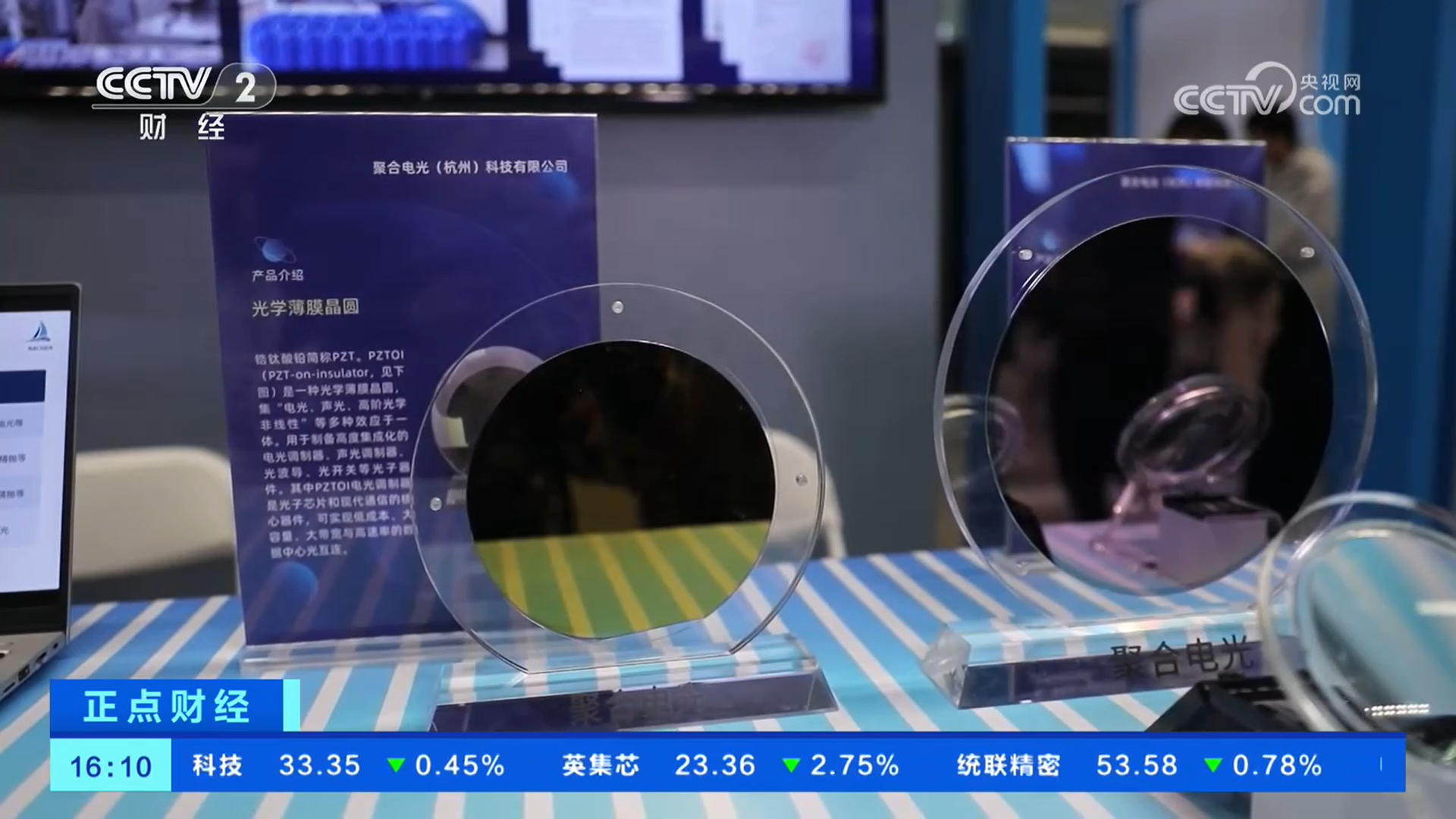 会场设置100多个展位,在西湖区科技展位,21项来自浙大、西湖大学等高校科研平台的前沿成果集中亮相。从国科大杭高院孵化的聚合电光,最新8英寸光学薄膜晶圆正筹备量产。