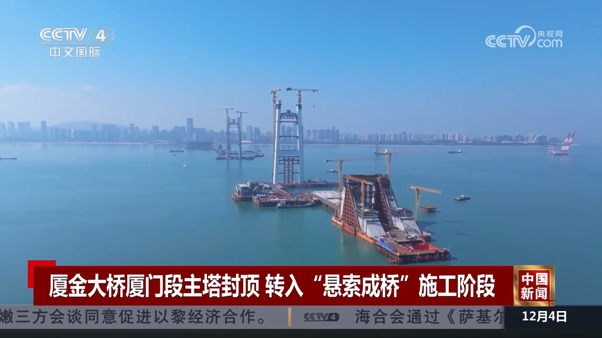 央视网消息:近日,厦金大桥关键控制性工程刘五店航道桥主塔完成封顶,标志着大桥建设取得了里程碑式的重大进展,从“立塔成型”转入“悬索成桥”关键施工阶段。