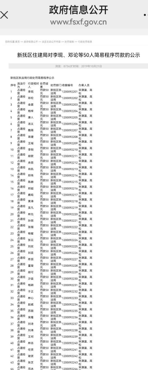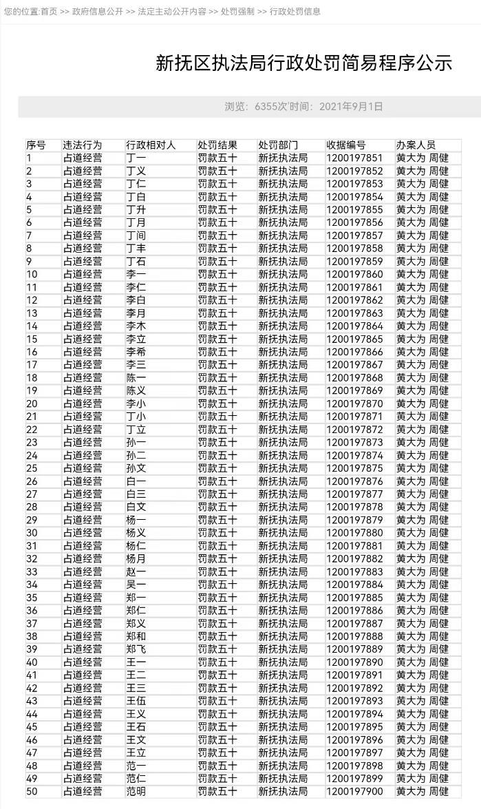 极目新闻记者还注意到,新抚区执法局2021年9月1日还公示了多人占道经营被行政处罚的文件,名单上50人均被罚款50元,名单合计罚款2500元。记者看到,该名单上被罚款的有丁一、李一、陈一、孙一、白一、赵一、吴一、郑一、杨一、王一、范一,还有丁义、陈义、杨义、王义,都是两个字的姓名。