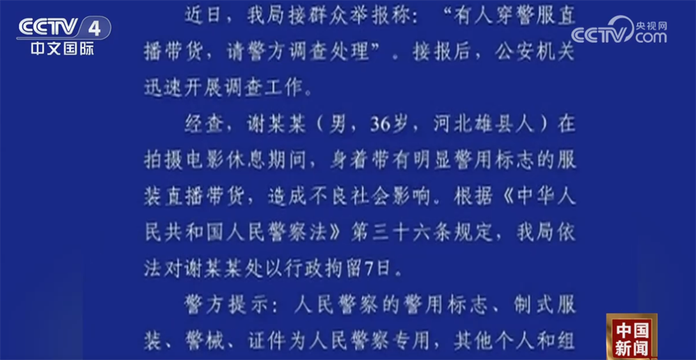 在被群众举报后,云南耿马傣族佤族自治县公安局发布警情通报称:谢孟伟在拍摄电影休息期间,身着带有明显警用标志的服装直播带货,造成不良社会影响。根据《中华人民共和国人民警察法》第三十六条规定,依法对其处以行政拘留7日。对此事,谢孟伟也在他的直播间进行了道歉。随后,谢孟伟的抖音账号被封禁。