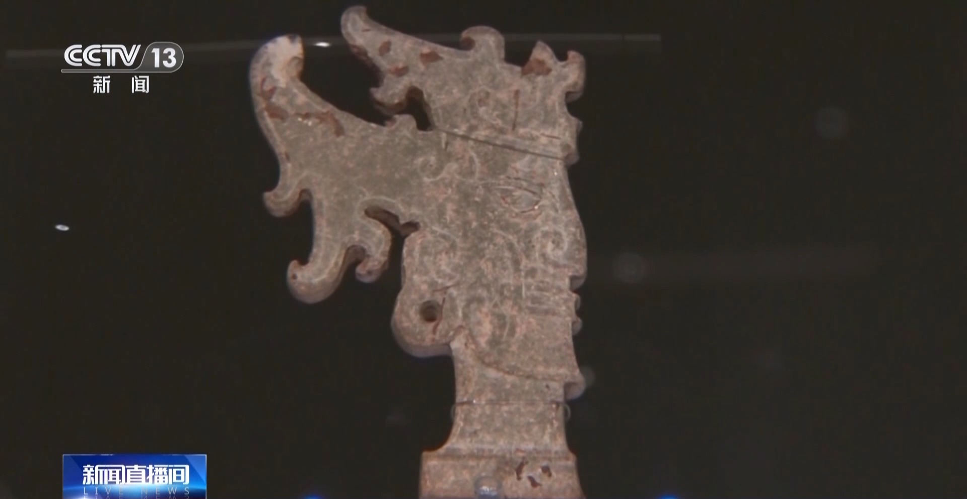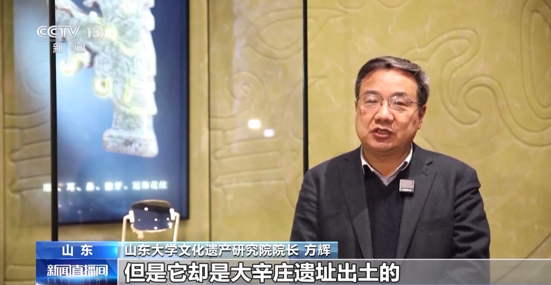 山东大学文化遗产研究院院长 方辉:它的尺寸很小,只有5厘米多一点,但它却是大辛庄遗址出土的非常重要的一件具有代表性的文物。它应该是古代祖先神的形象,头戴华丽的羽冠,典型的臣字眼,过去在商代出土的很少,反而是在龙山文化时代(距今4000年到4500年)一种流行的祖先神的图案。