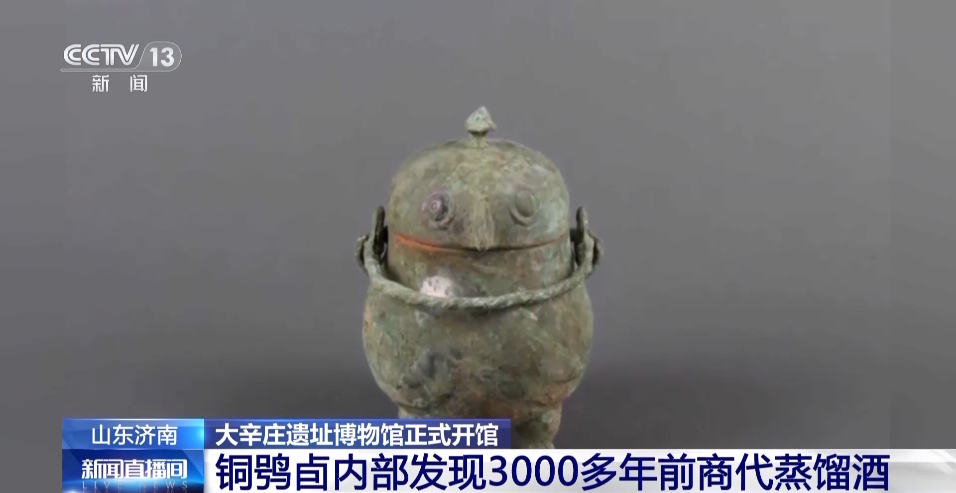 这件铜鸮卣出土于大辛庄遗址中一座规格较高的商代晚期墓葬,考古人员在对它修复的过程中,在其内部发现了3000多年前商代的蒸馏酒,丰富了我国蒸馏酒的历史。