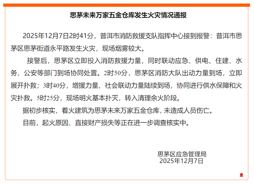据初步核实,着火建筑为思茅未来万家五金仓库,未造成人员伤亡。目前,起火原因、直接财产损失等正在进一步调查核实中。