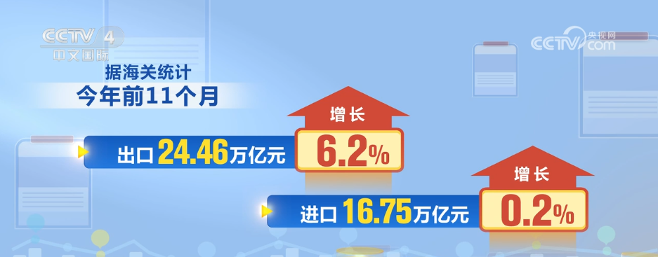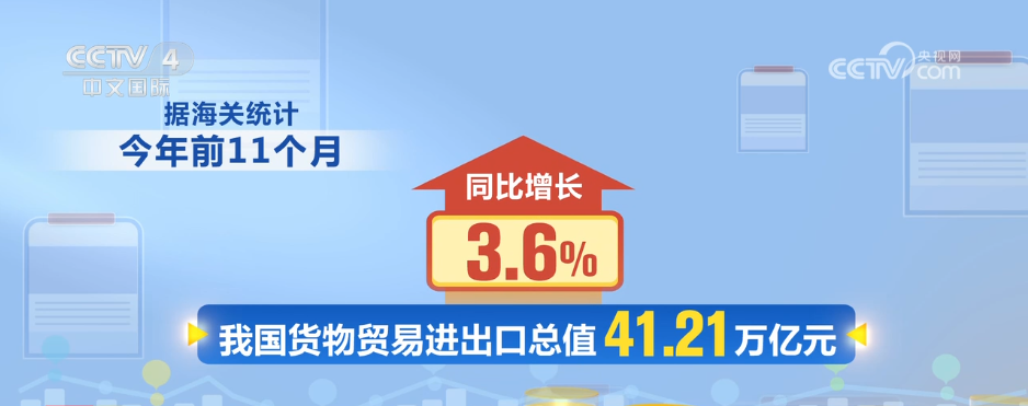 央视网消息:海关总署12月8日对外公布,今年前11个月,中国货物贸易保持增长,进出口总值41.21万亿元,同比增长3.6%。