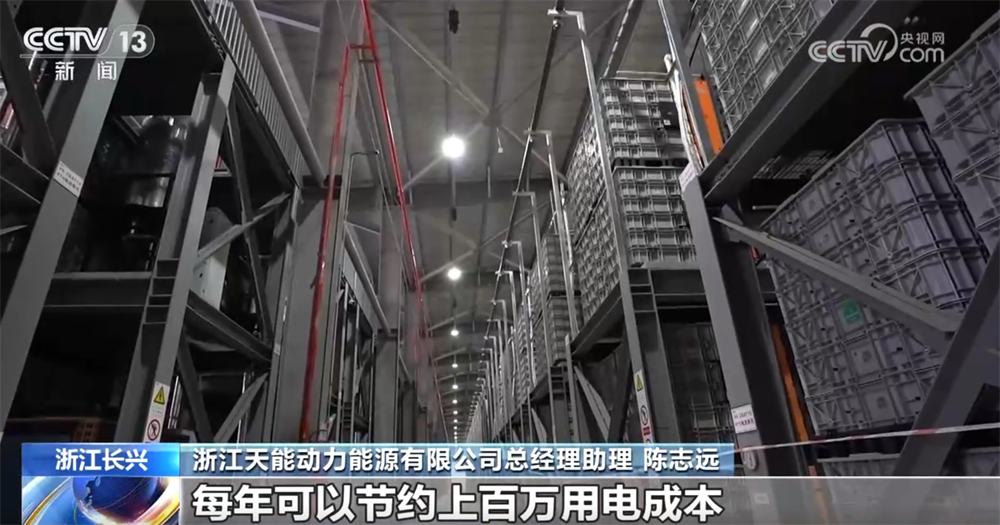 浙江天能动力能源有限公司总经理助理 陈志远:新型储能电站就建在我们的园区,它能够让我们晚上的电充好以后,在白天高峰的时候用起来,每年可以节约上百万元用电成本。