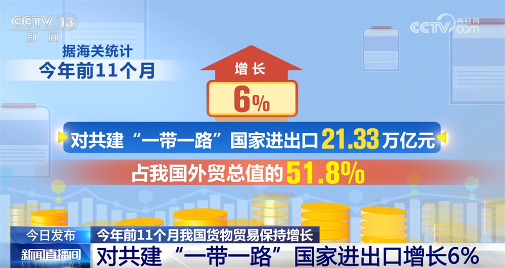 据海关统计,今年前11个月,我国货物贸易进出口总值41.21万亿元,同比增长3.6%。其中,出口24.46万亿元,增长6.2%;进口16.75万亿元,增长0.2%。对共建“一带一路”国家进出口21.33万亿元,增长6%,占我国外贸总值的51.8%。