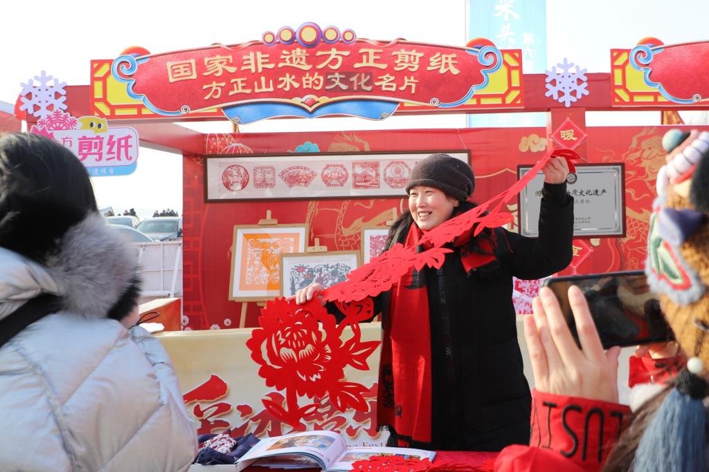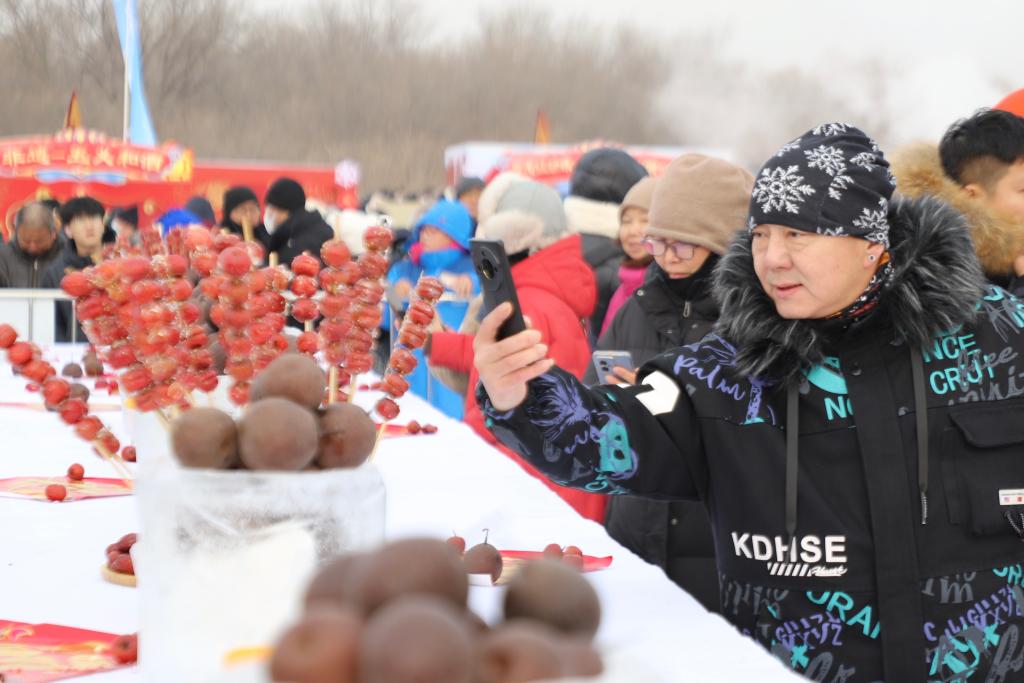“尔滨”的火热,始于采冰,不止采冰。不远处的非遗文化体验区同样热闹。赫哲族鱼皮制品、桦树皮摆件、方正剪纸、精美蛋雕,引得游客拍照打卡。
