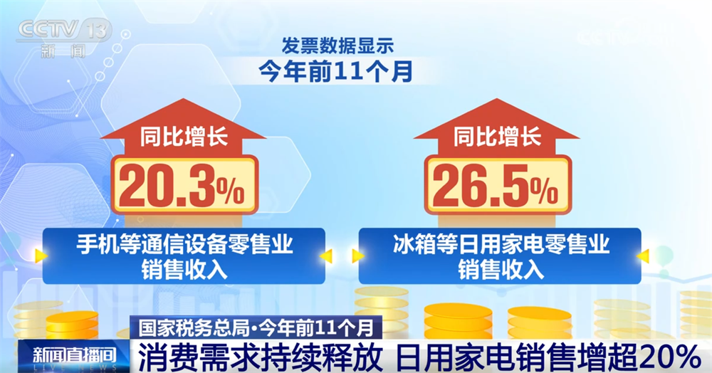 发票数据显示,今年前11个月,手机等通信设备零售业、冰箱等日用家电零售业销售收入同比分别增长20.3%、26.5%。新能源汽车消费也持续向好,新能源乘用车销售收入同比增长19.1%。