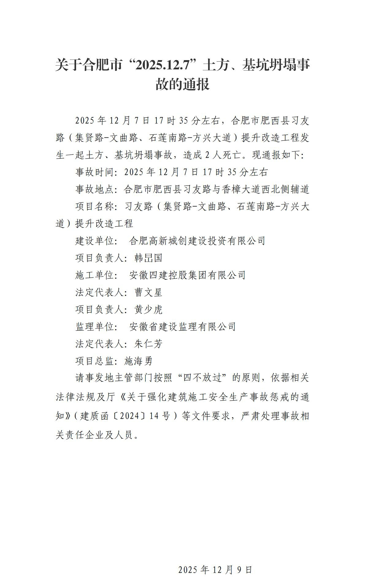 据安徽省住房城乡建设厅网站消息,12月7日17时35分左右,合肥市肥西县习友路(集贤路-文曲路、石莲南路-方兴大道)提升改造工程发生一起土方、基坑坍塌事故,造成2人死亡。