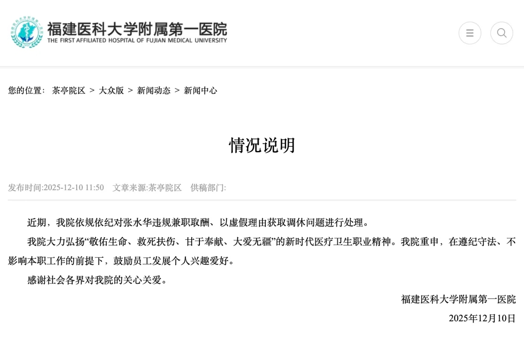 近日,一份《福建医科大学附属第一医院关于对张水华的处理决定》显示,张水华存在违规兼职取酬、以虚假理由获取调休等问题,被给予警告处分,影响期为6个月。医院上述情况说明证实,该通报属实。