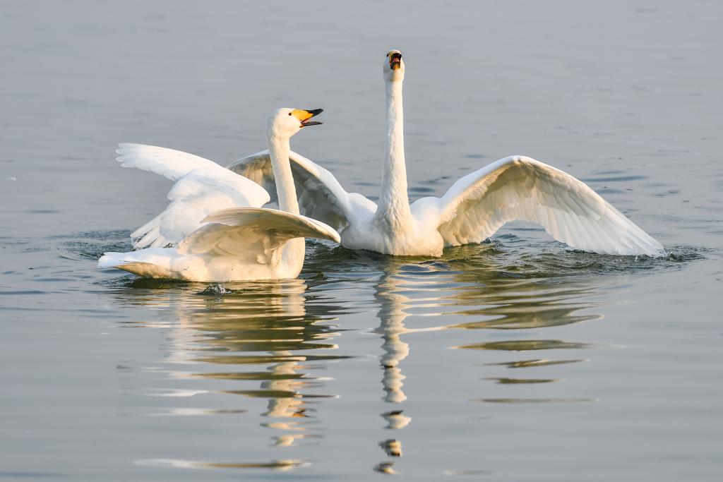 新华社太原12月13日电(记者柴婷)在山西平陆黄河湿地保护区,一批批来自西伯利亚的野生大天鹅陆续飞抵,开始越冬。据悉,自10月底起,大天鹅已开始分批抵达黄河湿地,进入12月后数量明显增加,目前该区域观测到的越冬天鹅已超5000只,到明年1、2月份可达上万只。它们悠然自得的身影,为黄河岸畔增添了一道灵动的风景线。