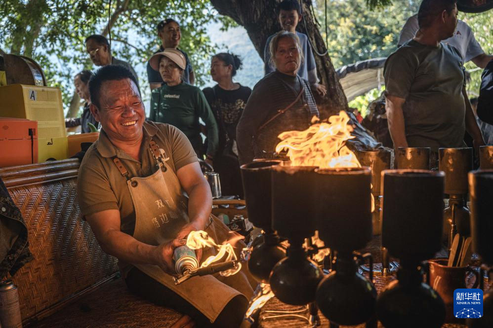 11月15日,李金合在云南省保山市隆阳区芒宽乡的“路边咖啡馆”制作“火烧咖啡”。新华社记者 高咏薇 摄