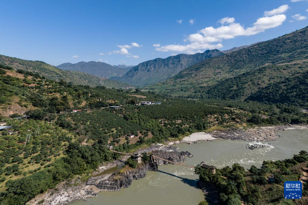 这是11月15日在云南省保山市隆阳区芒宽乡拍摄的横跨怒江的双虹桥,李金合经营的“路边咖啡馆”位于双虹桥边(无人机照片)。新华社记者 高咏薇 摄