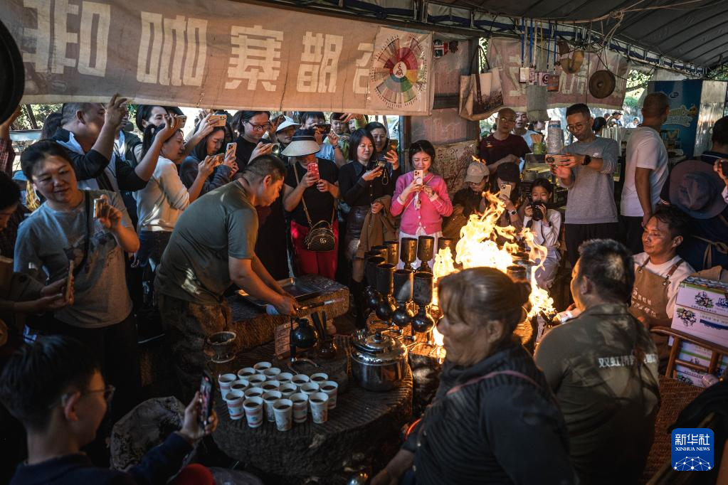 11月15日,在云南省保山市隆阳区芒宽乡的“路边咖啡馆”,游客观看李金合制作“火烧咖啡”。新华社记者 高咏薇 摄